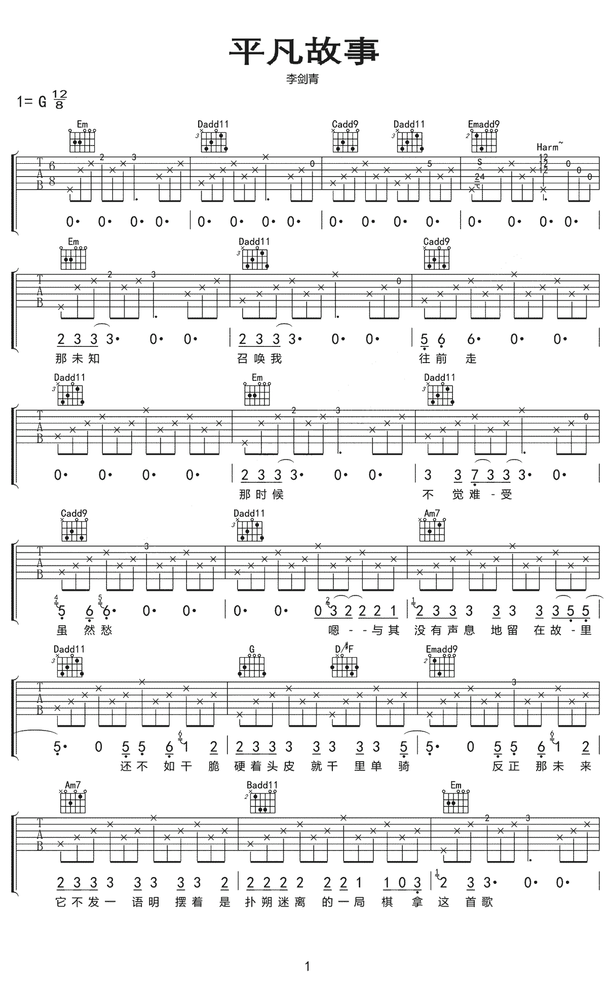 平凡故事吉他谱-李剑青本曲谱选调:G和弦。...