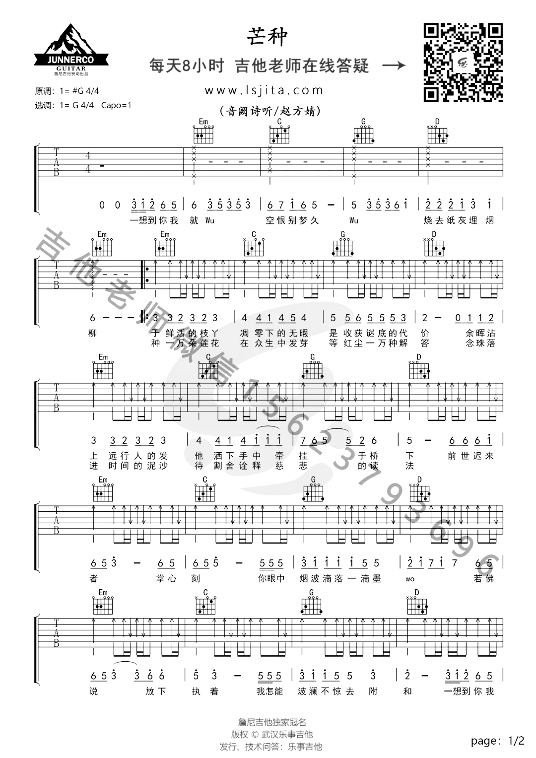 芒种吉他谱G调弹唱谱音阙诗听/赵方婧选G变调夹1品...