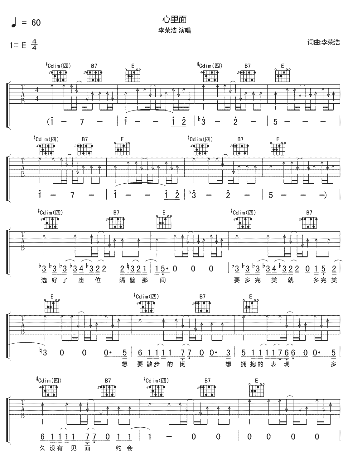 心里面吉他谱-李荣浩曲谱选E调和弦指法编配,节拍速度60。...