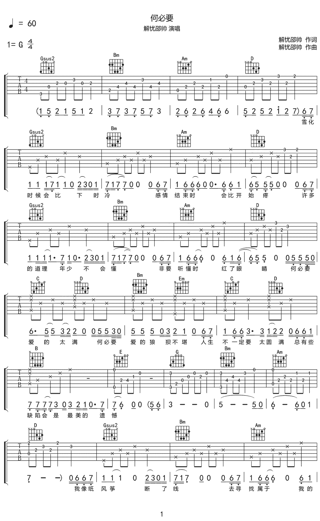 何必要吉他谱-解忧邵帅曲谱选G和弦指法编配,节拍:60...