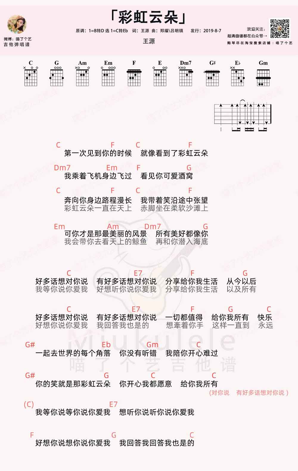 彩虹云朵吉他谱-王源原调:1=B转D,选调1=C转降E。...