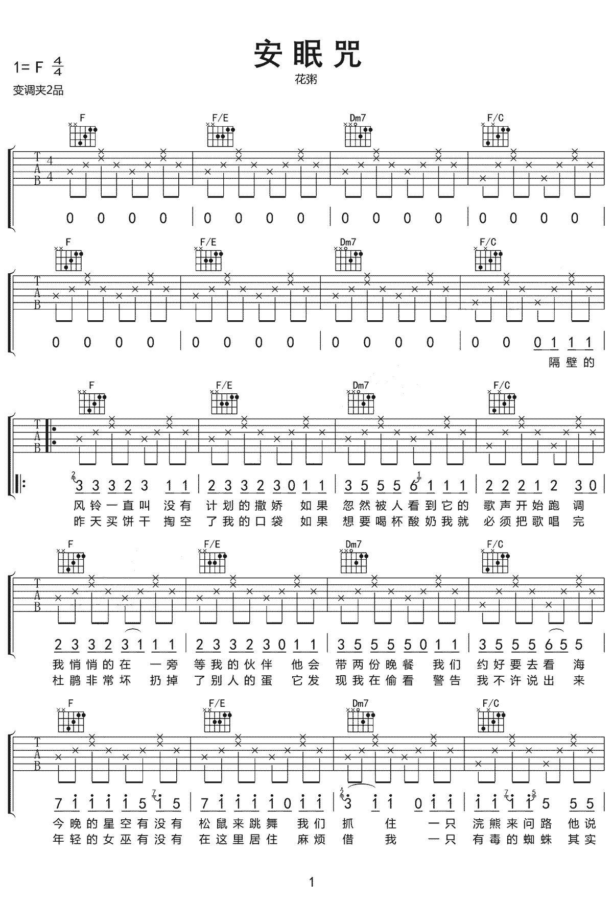 安眠咒吉他谱-花粥原调1=降B,CAPO:1品,选调1=A。...