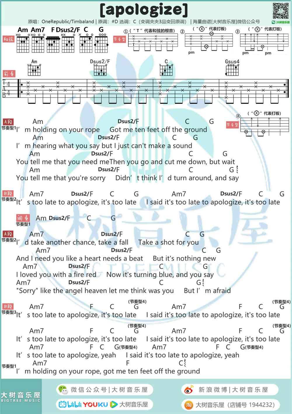 Apologize吉他谱-OneRepublic原调#D,选C调和弦指法编配,(PAPO1品)。...