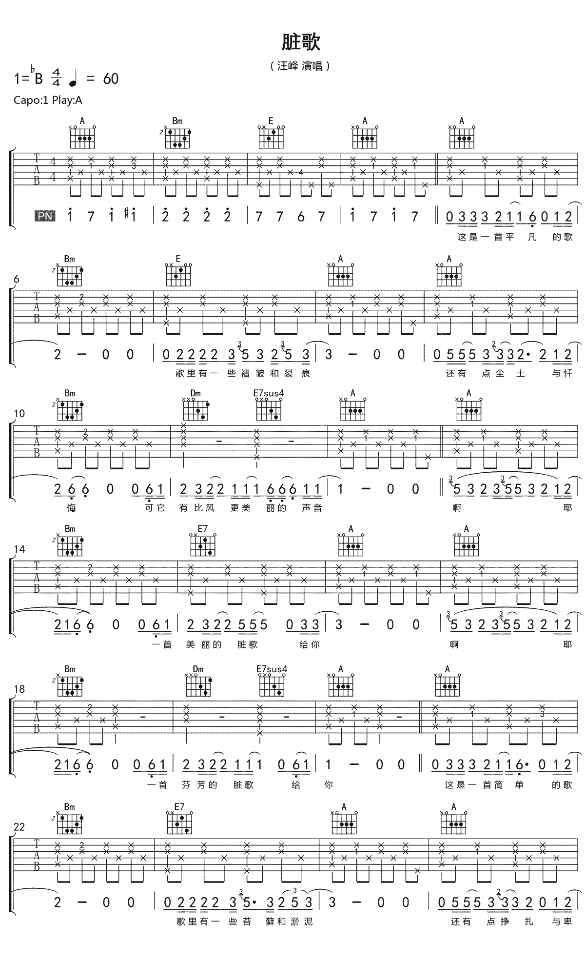 脏歌吉他谱-汪峰原调1=降B,CAPO:1品,选调1=A。...