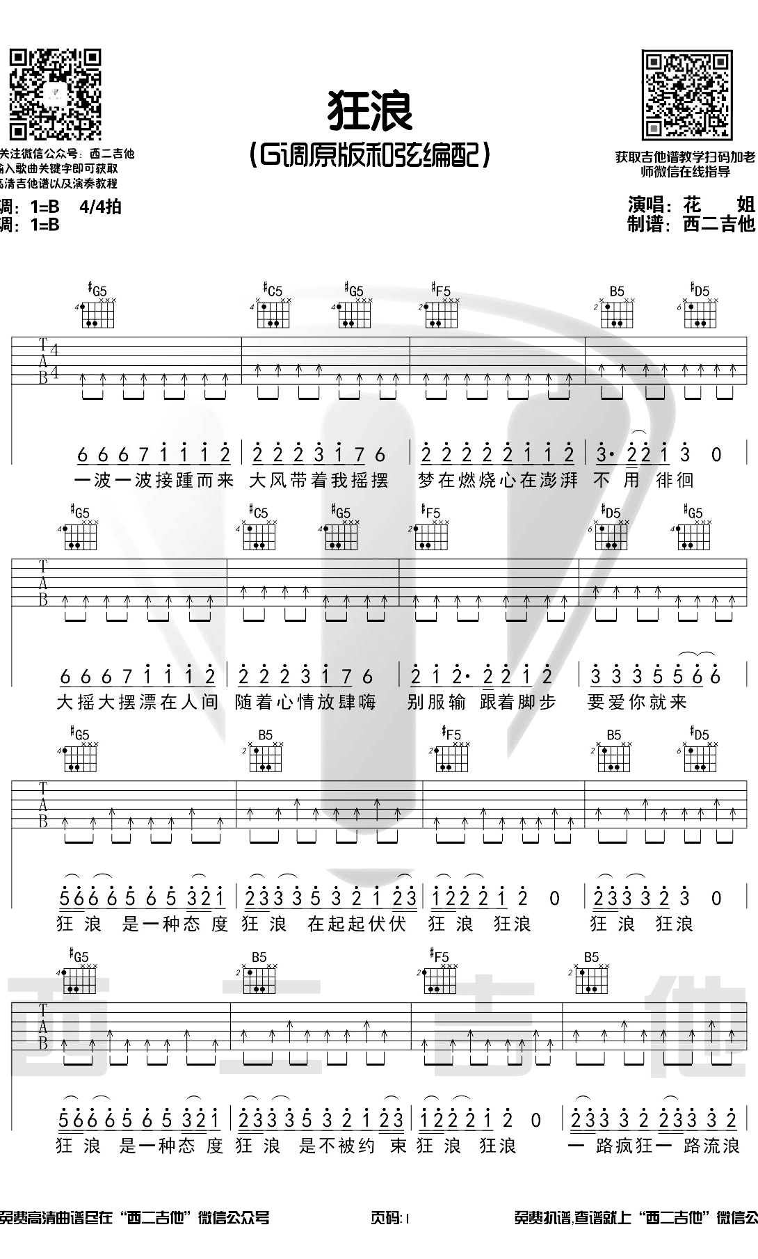 吉他 狂浪吉他谱 G调原版 花姐