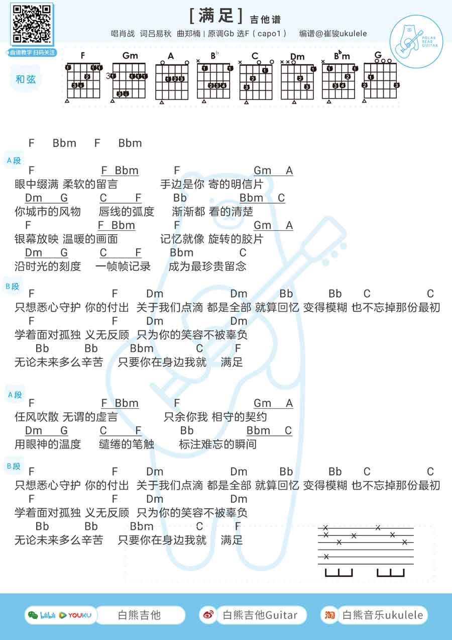 满足吉他谱肖战原调:降G,选1=F调指法编配,CAPO=1品。...