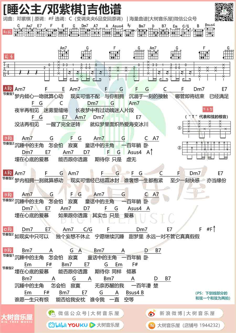 睡公主吉他谱-邓紫棋原调#F,本曲谱选C调和弦指法编配,简单版。...