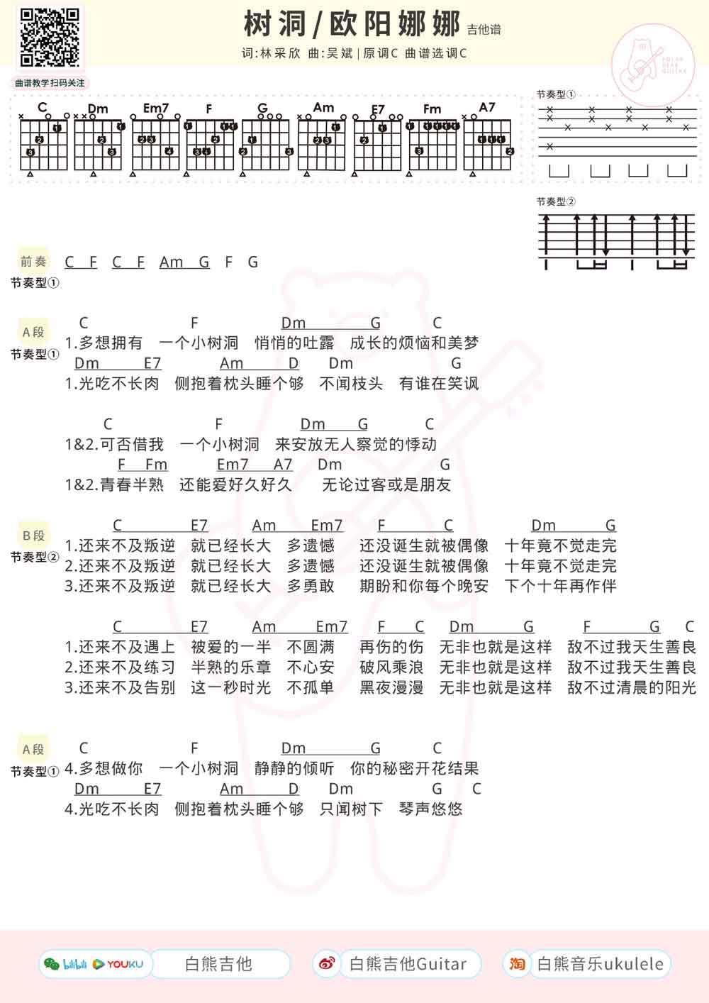 树洞吉他谱欧阳娜娜曲谱选C调和弦指法编配。...