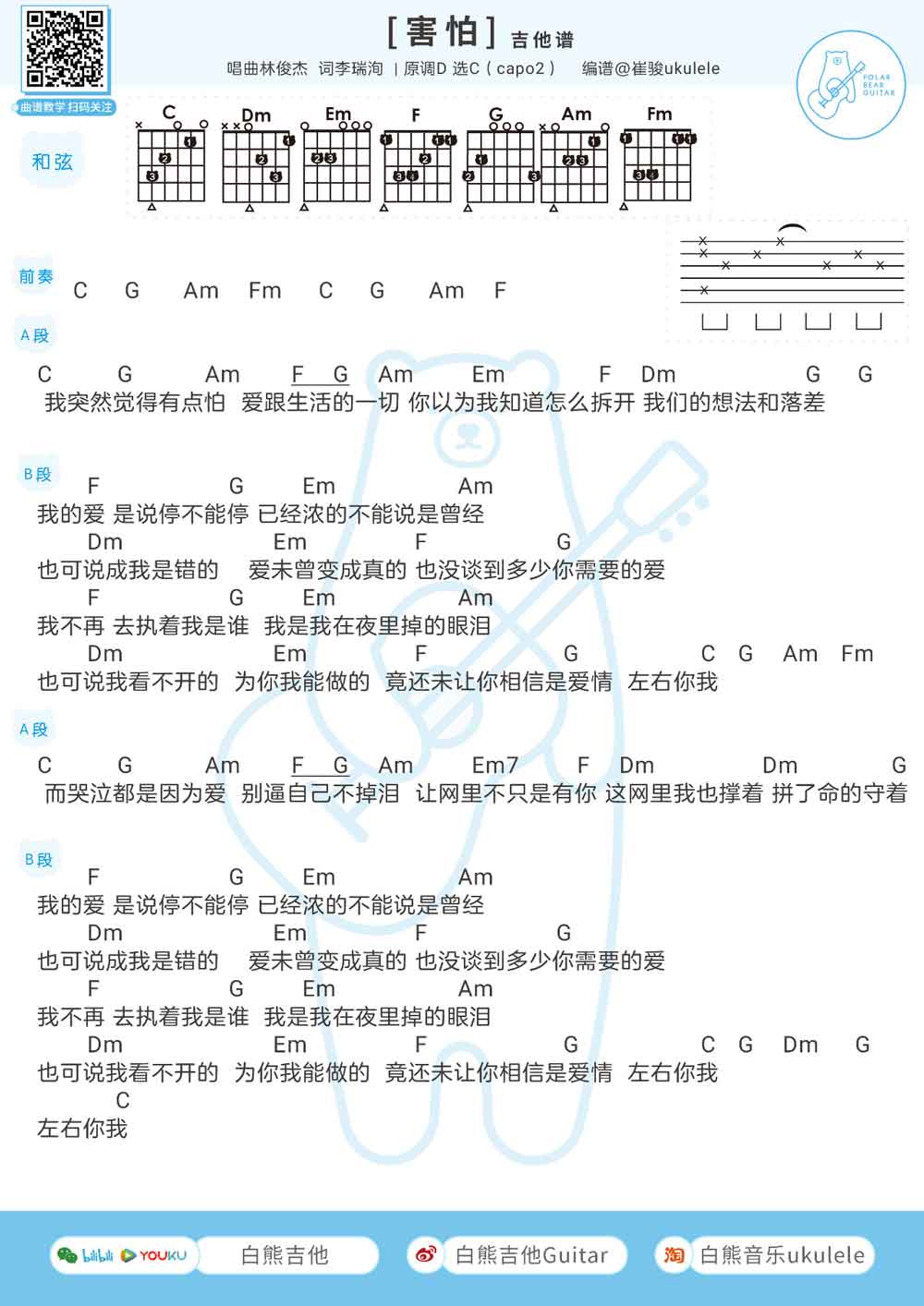 害怕吉他谱林俊杰原调:1=D,选调:1=C,(CAPO2品)。...