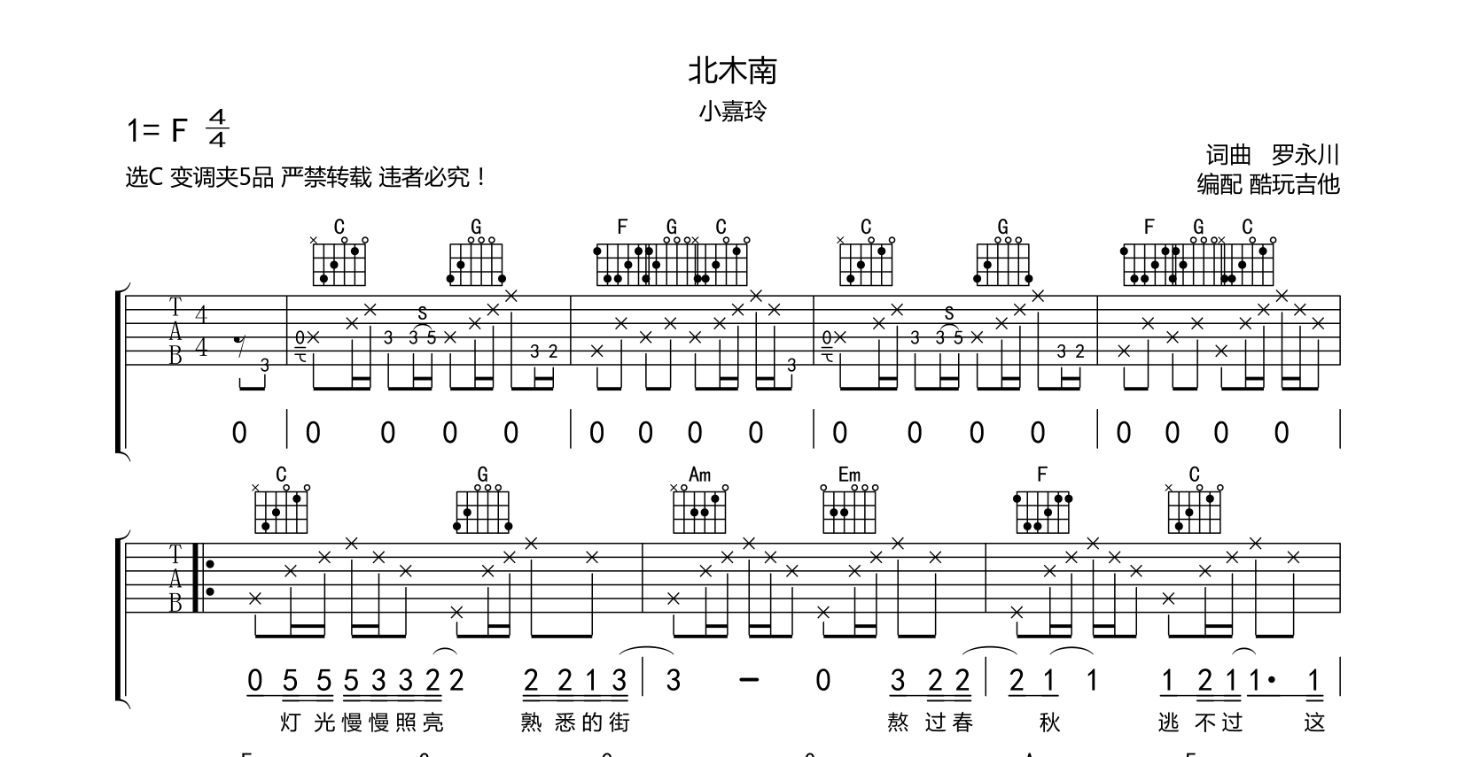 北木南吉他谱小嘉玲还原编配选C变调夹5品音频手机录制附带前奏间奏原曲两把吉他这里为了演奏仿版采用结合形式编配...