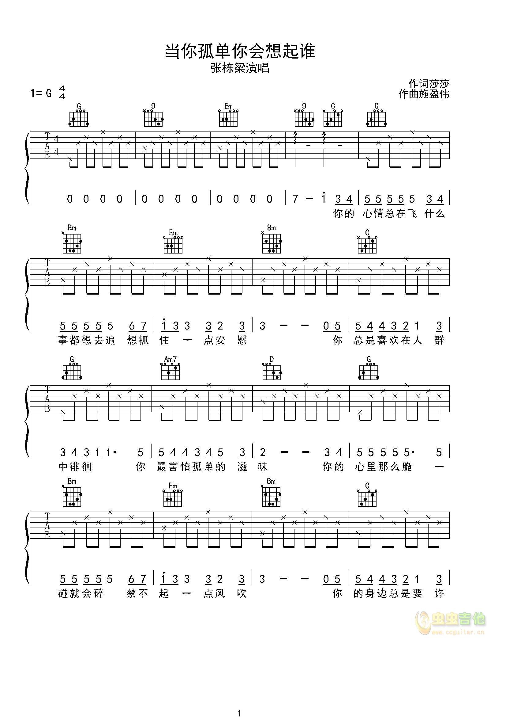 当你孤单你会想起谁吉他谱简易版张栋梁...