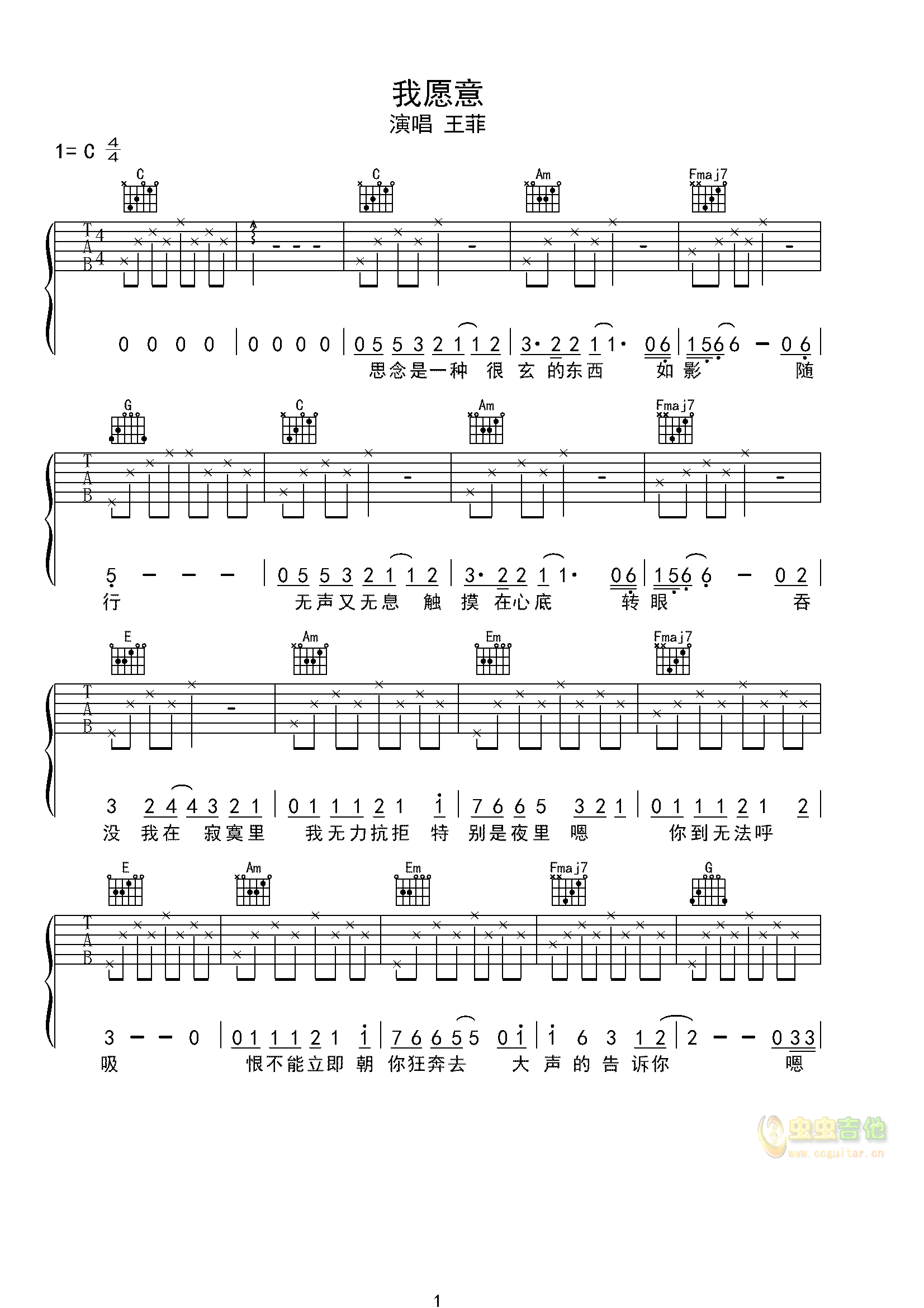 吉他我愿意吉他谱 简易版 王菲