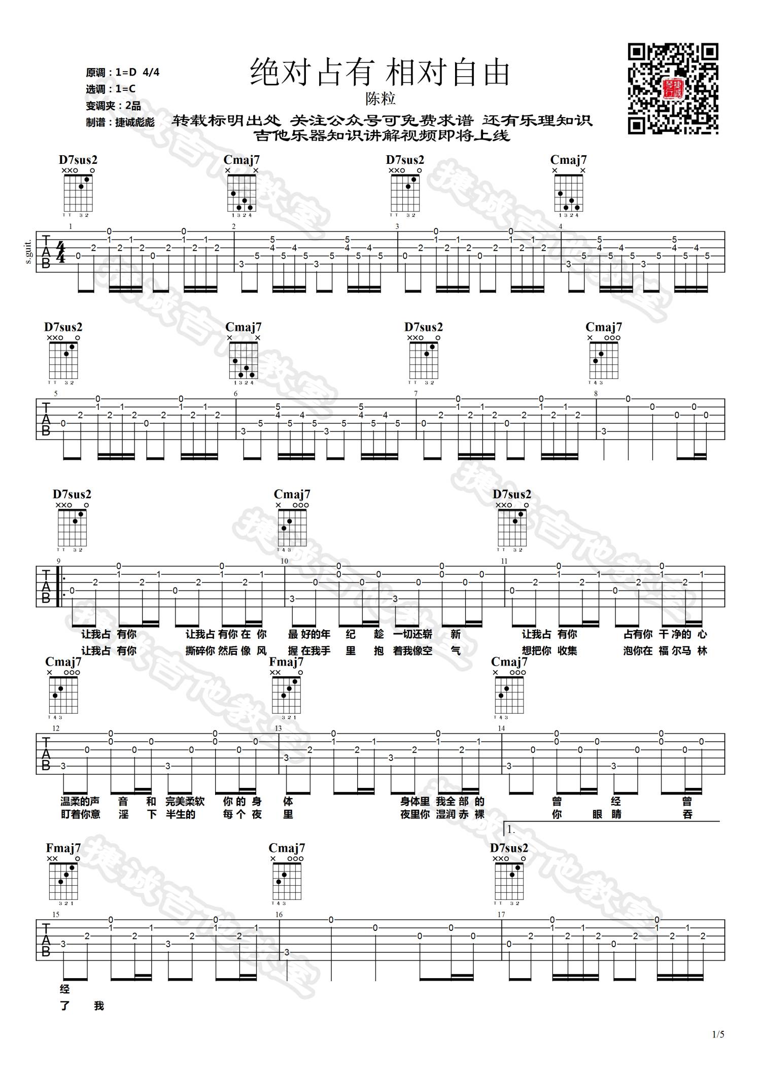 绝对占有相对自由吉他谱陈粒原调D调,弹唱变调夹夹第二品。...