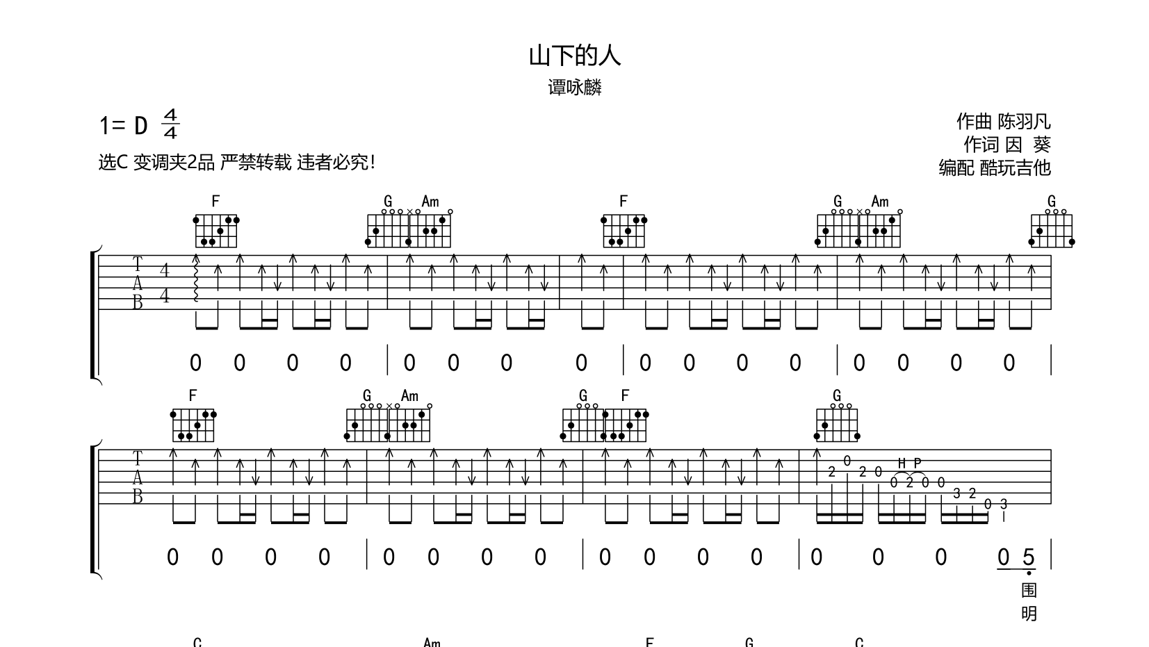 山下的人吉他谱谭咏麟还原版编配附带前奏尾奏...