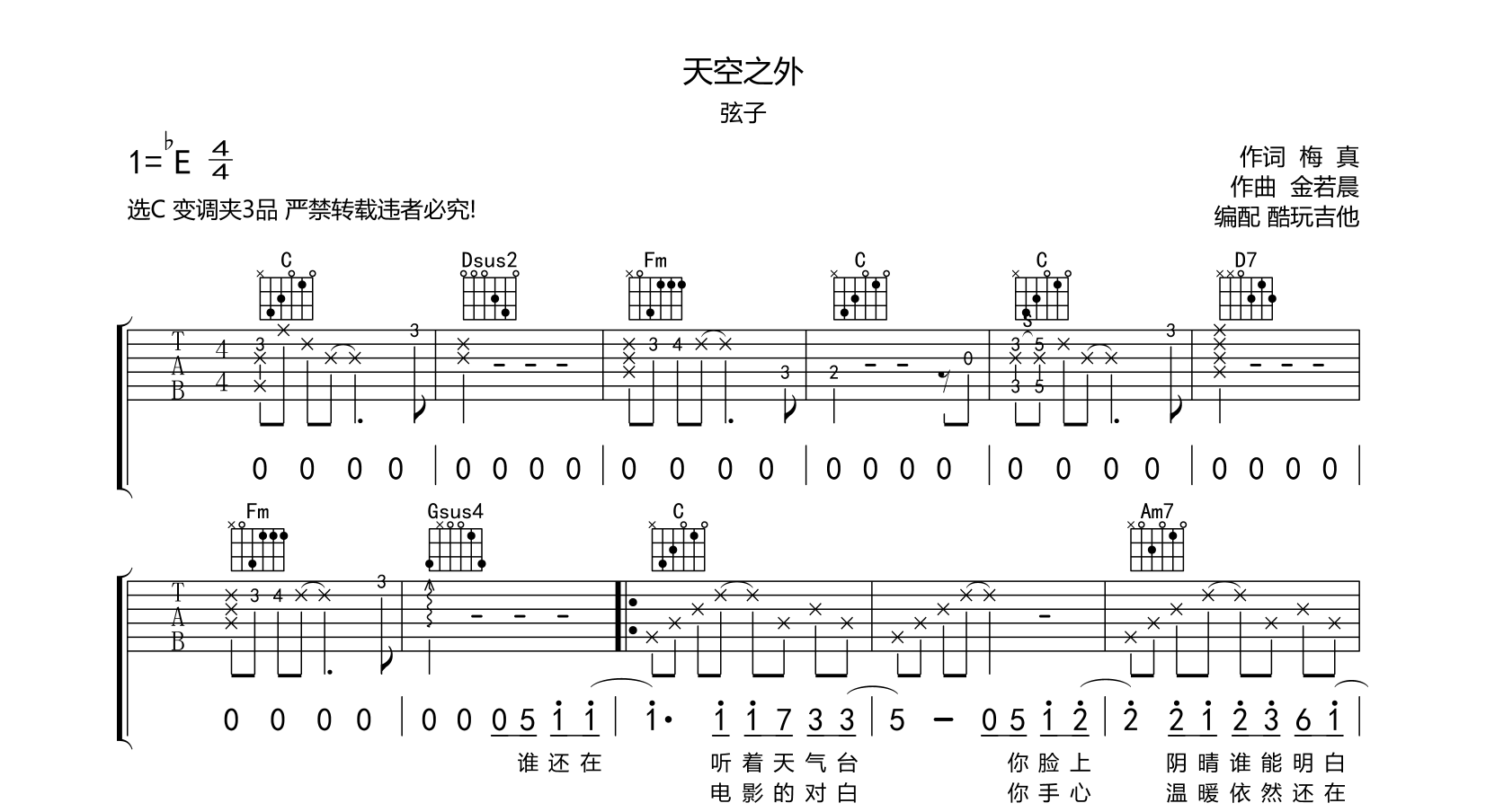 天空之外吉他谱弦子原曲伴奏为钢琴除前奏还原编配其他为个人色彩编配原调Eb选C变调夹3品...