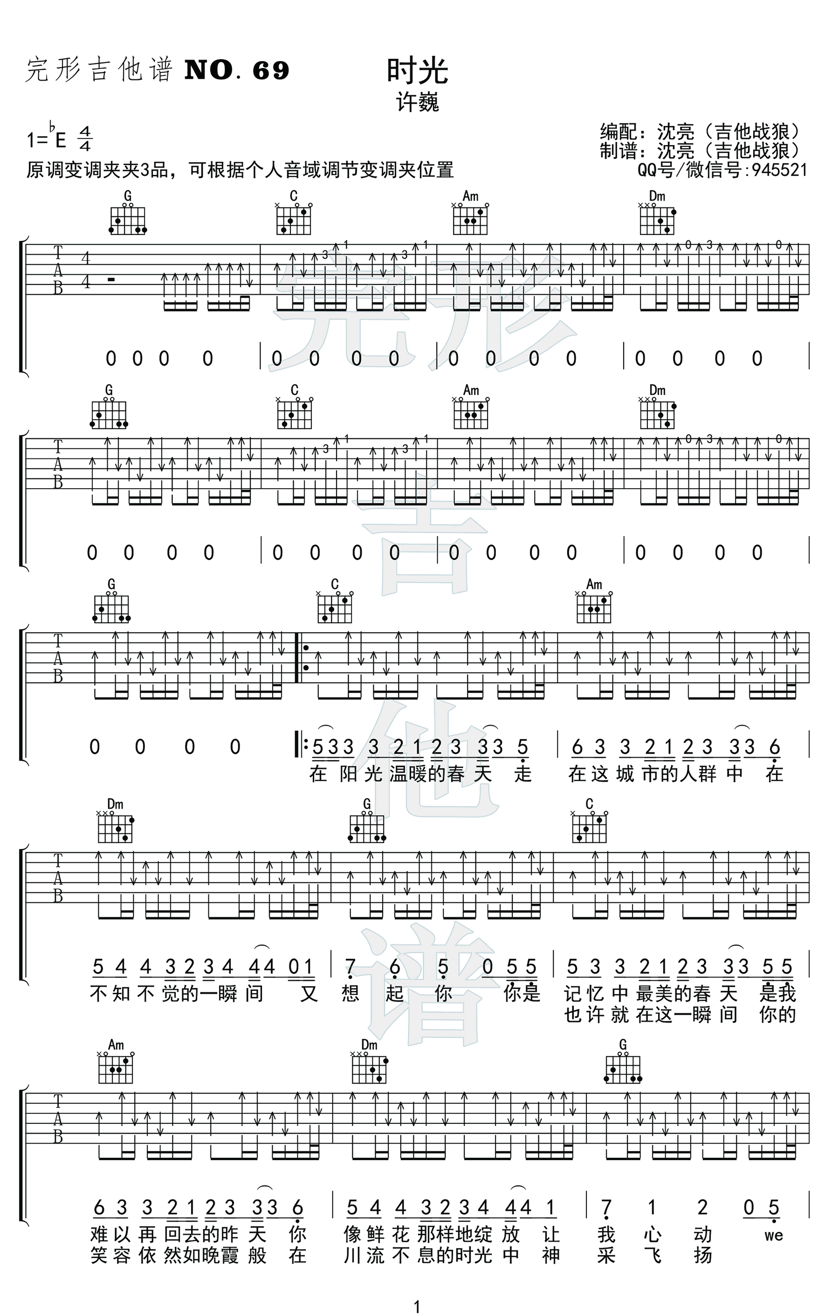 时光吉他谱许巍前奏扫弦版原调BBb变调夹夹三品...