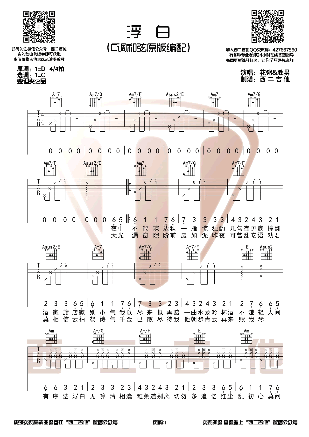 浮白吉他谱花粥&胜娚原调D,C调和弦原版编配,变调夹夹二品。西二吉他扒谱出品...