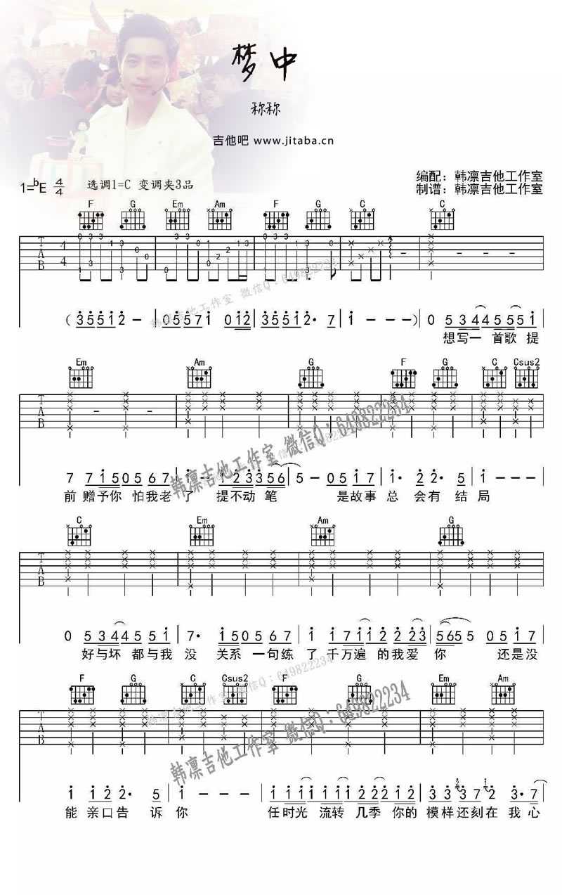 梦中吉他谱-乐橙称称写给魏晨的歌原调bE,选调C调,变调夹夹3品...