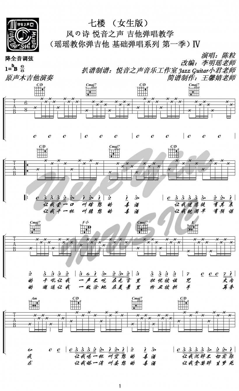 七楼吉他谱-陈粒七楼吉他弹唱谱女生版六线谱,降全音调弦编配...