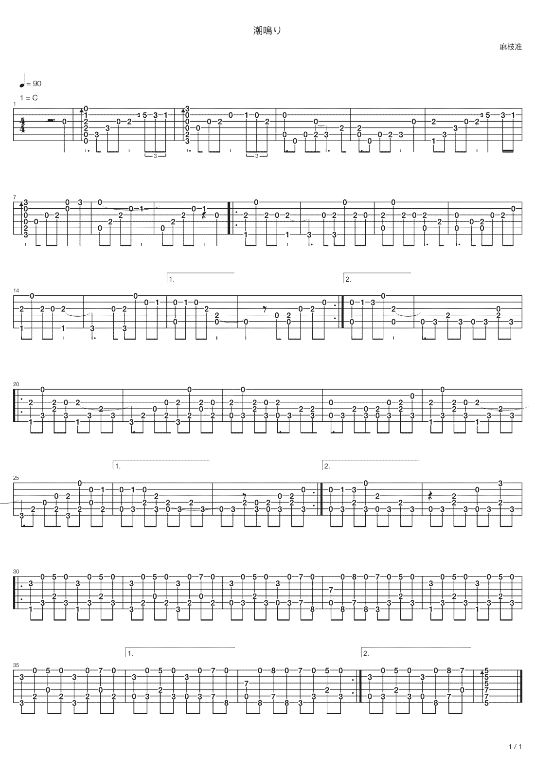 潮鸣吉他谱町田直哉指弹曲谱选调C调。《潮鸣》指弹,独奏谱...