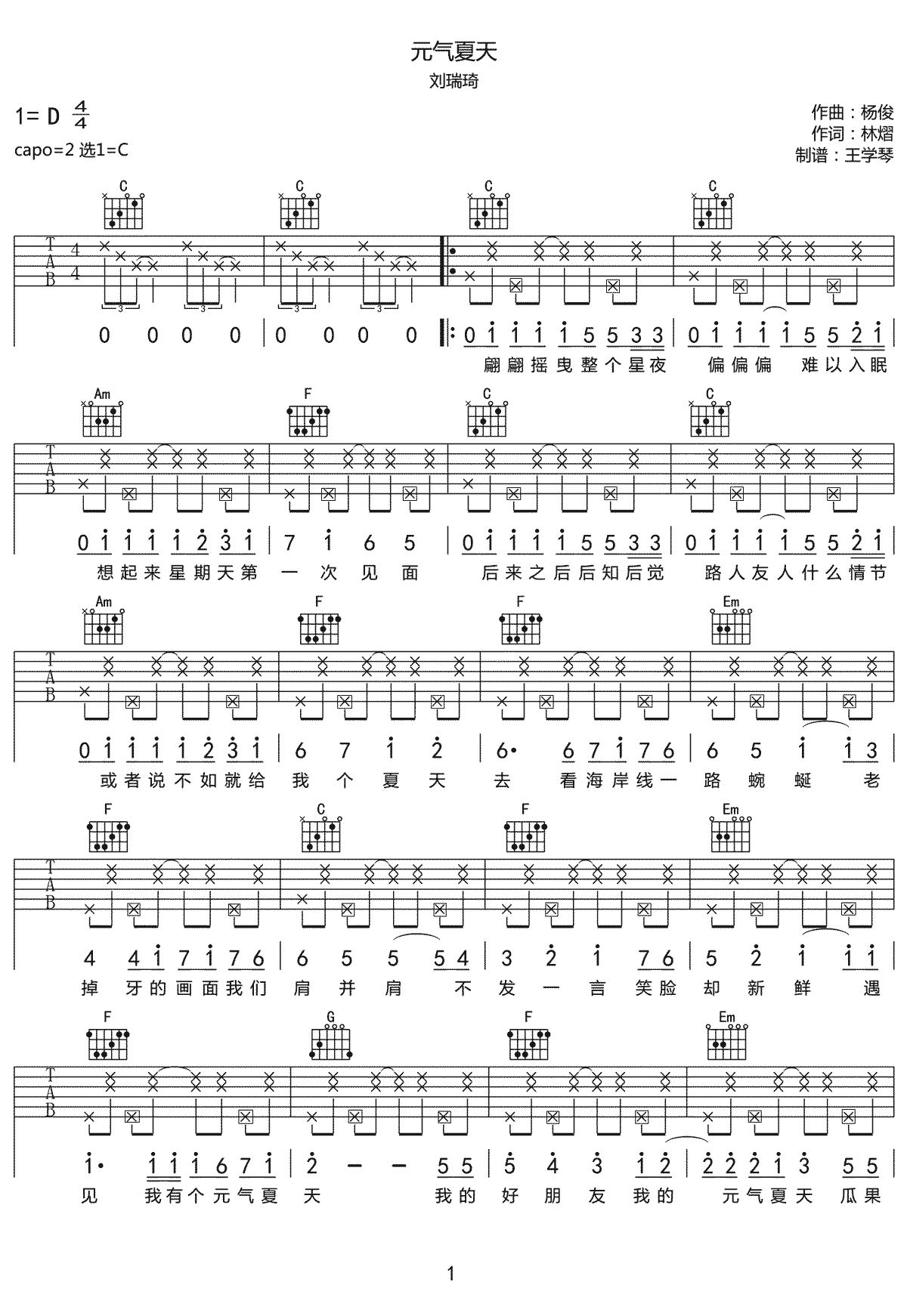元气夏天吉他谱刘瑞琦原调1=D,选调1=C,CAPO=2品...