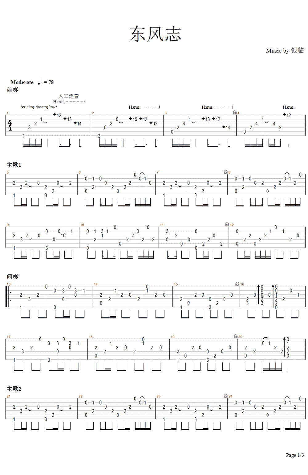 指弹《东风志》吉他独奏谱东风志吉他谱-银临...