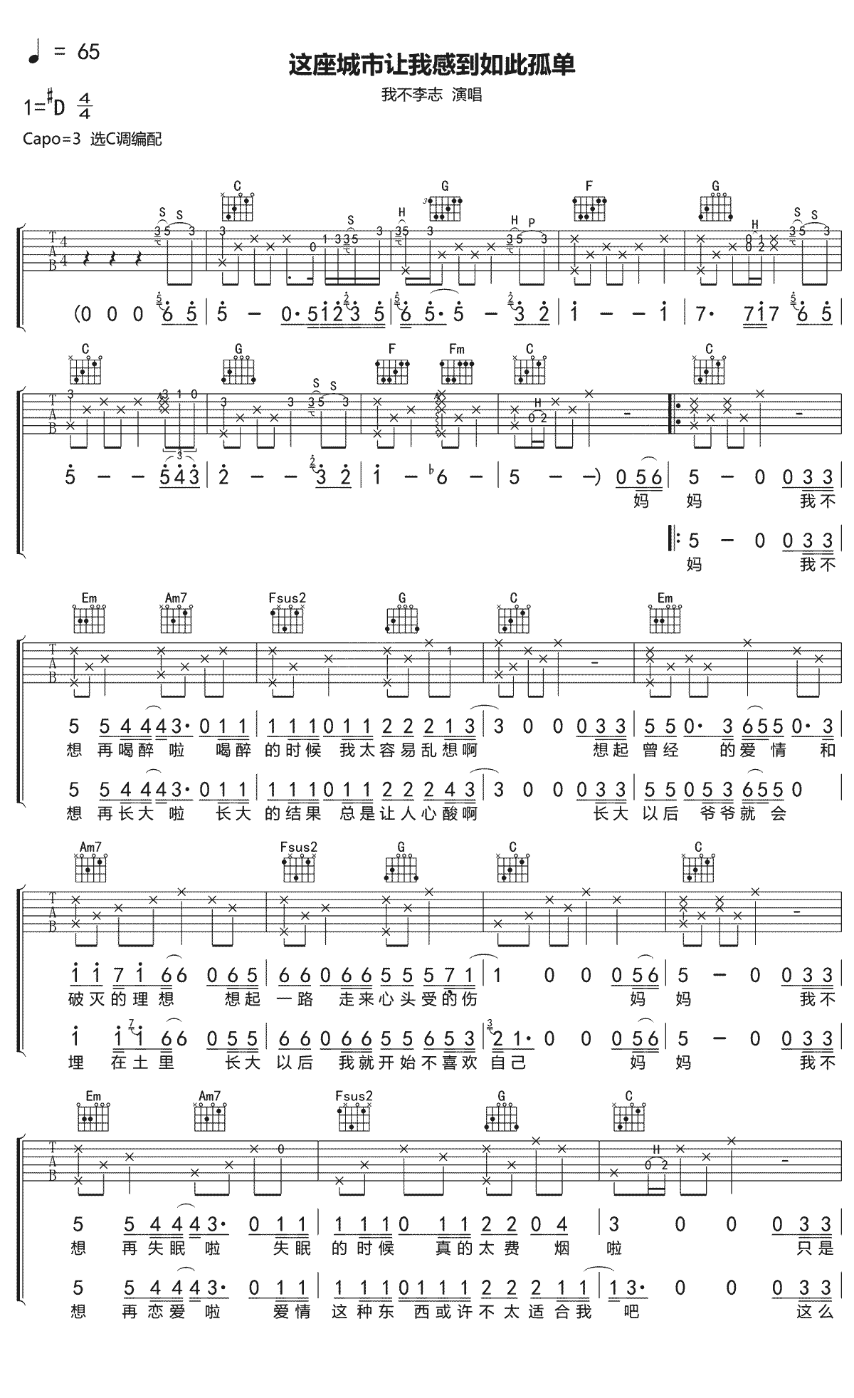 这座城市让我感到如此孤单吉他谱-我不李志曲谱原调:1=#D,本曲谱采用1=C编配,变调夹3品。...