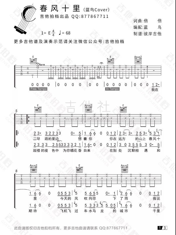 春风十里吉他谱吉他拍档出品原调E采用E编配...