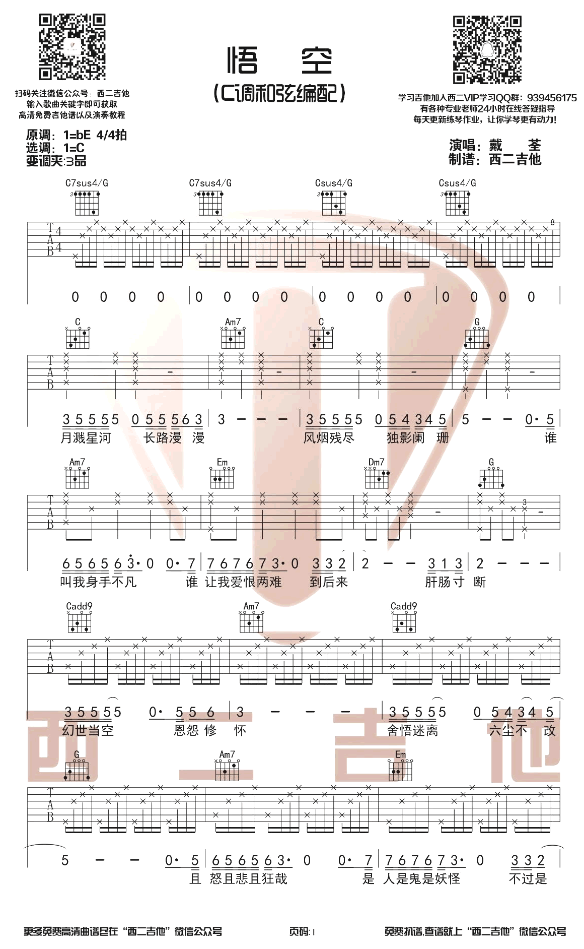 戴荃《悟空》吉他谱原调bE,选调C,变调夹夹三品,西二吉他编配...