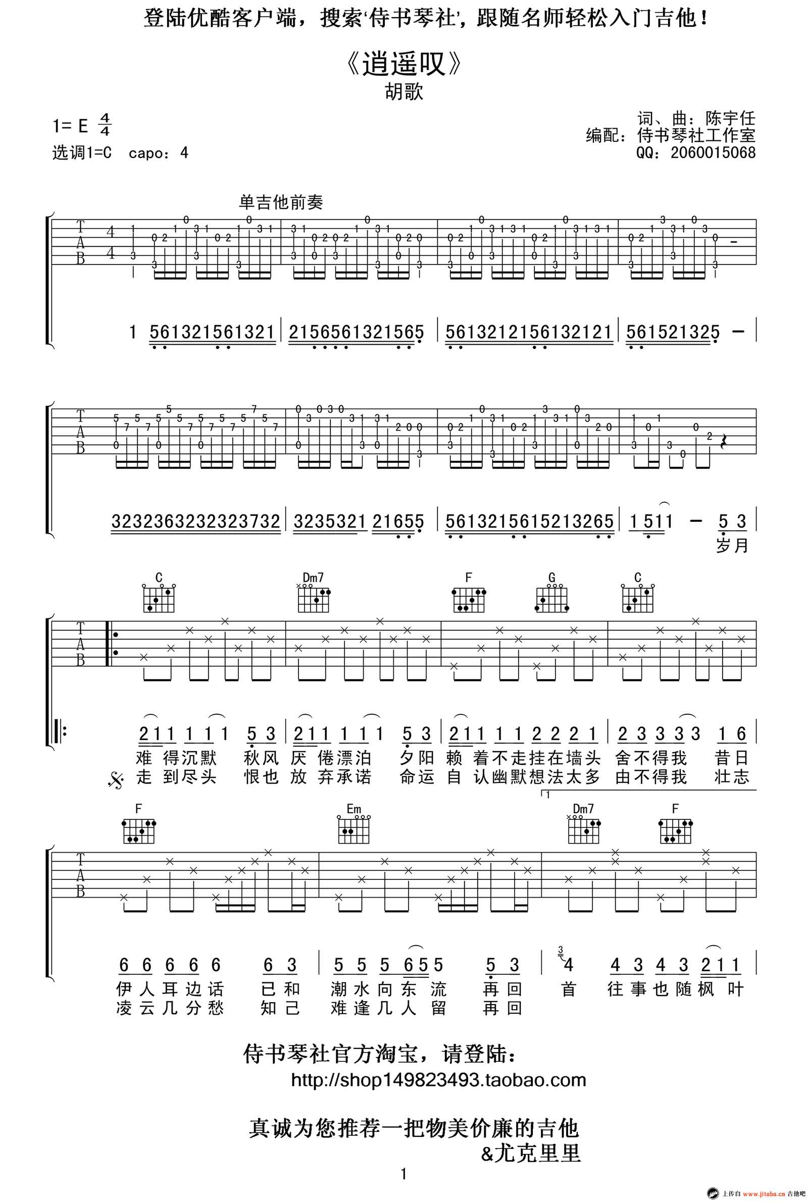 逍遥叹吉他谱《仙剑》插曲胡歌原调E,选调C,CAPO夹四品感谢侍书琴社工作出品。...