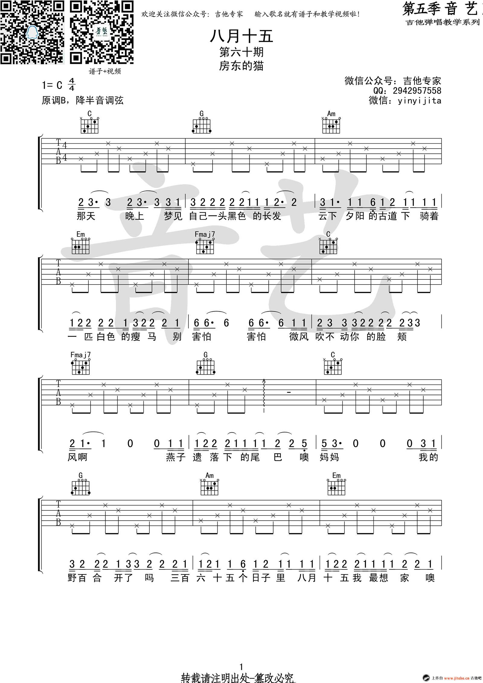 八月十五吉他谱房东的猫原调B选C琴弦全部降半音可不降...