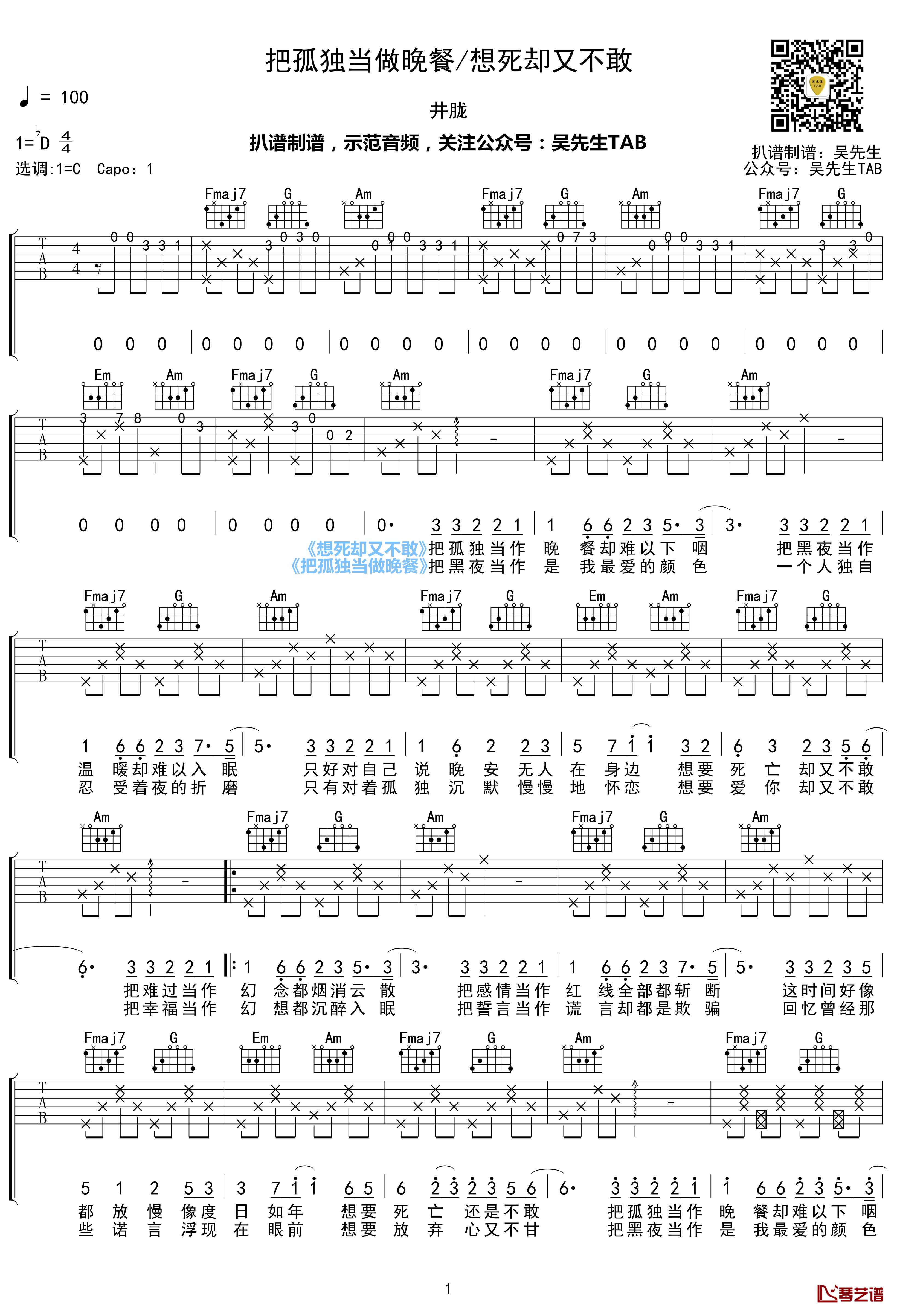 吉他把孤独当做晚餐/想死却又不敢 吉他谱 抖音热门