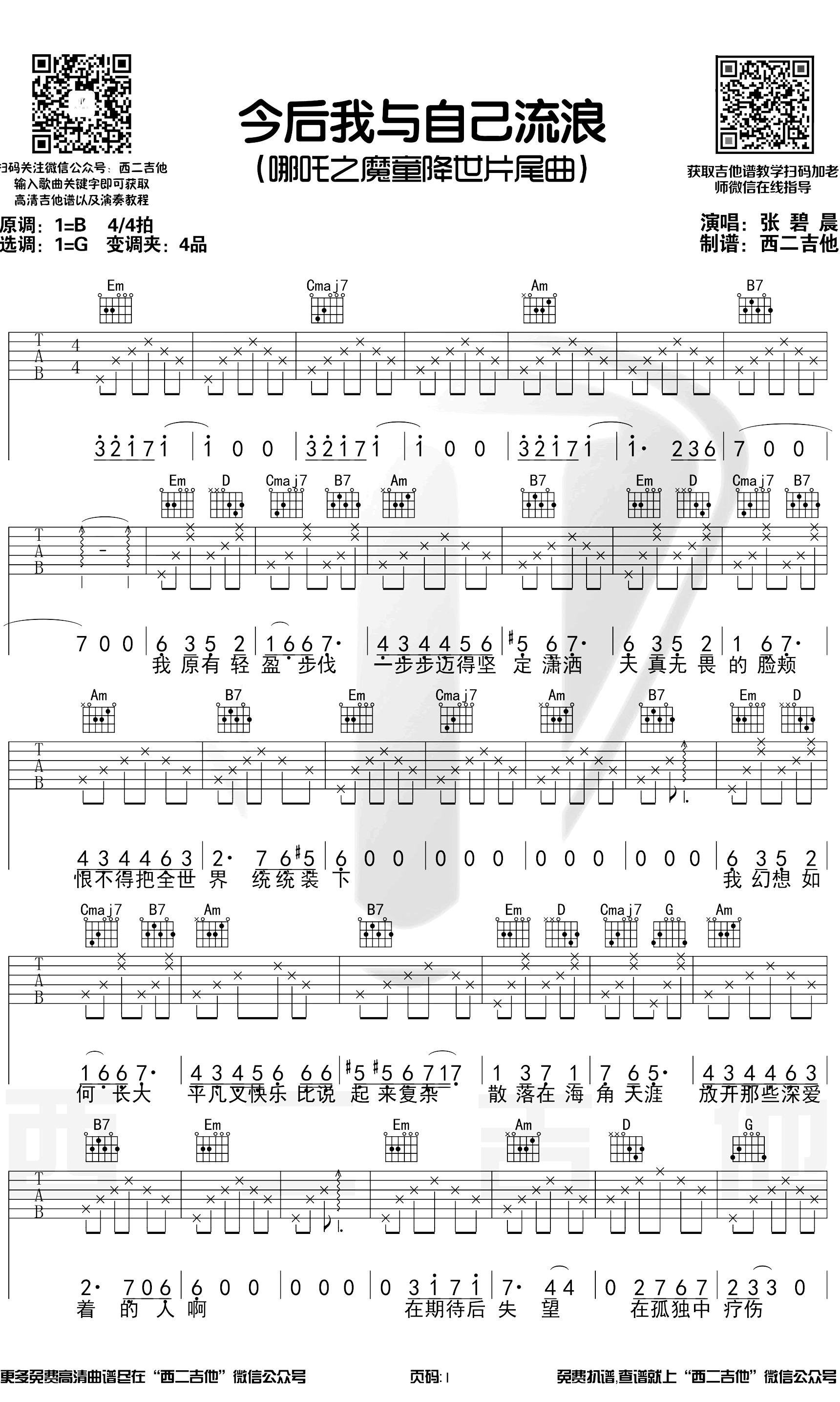 今后我与自己流浪吉他谱张碧晨原调C调4/4拍,选用G调编配,变调夹夹4品,动画电影《哪吒之魔童降世》片尾曲...