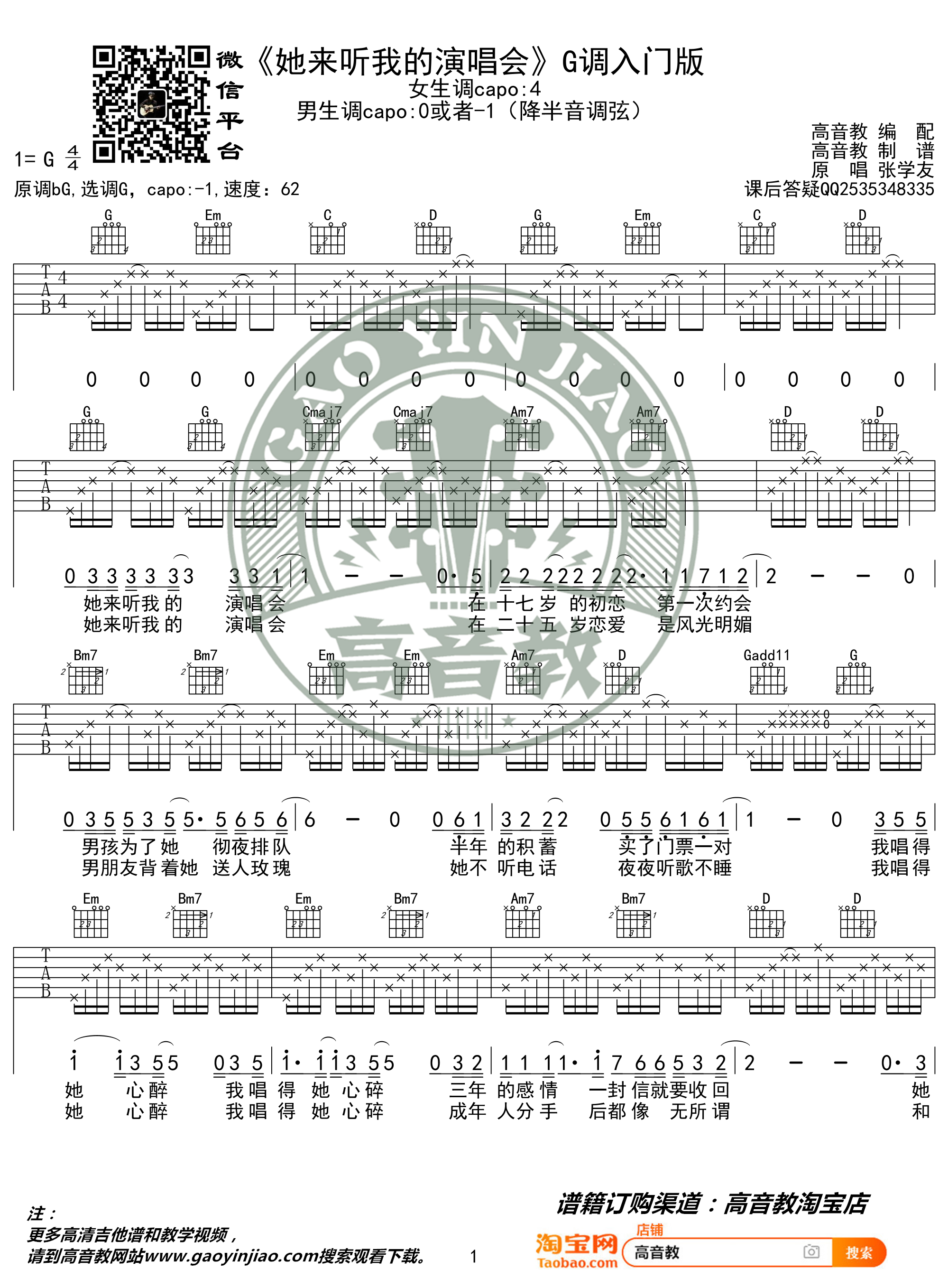 吉他 她来听我的演唱会 吉他谱 简单版 高音教编配