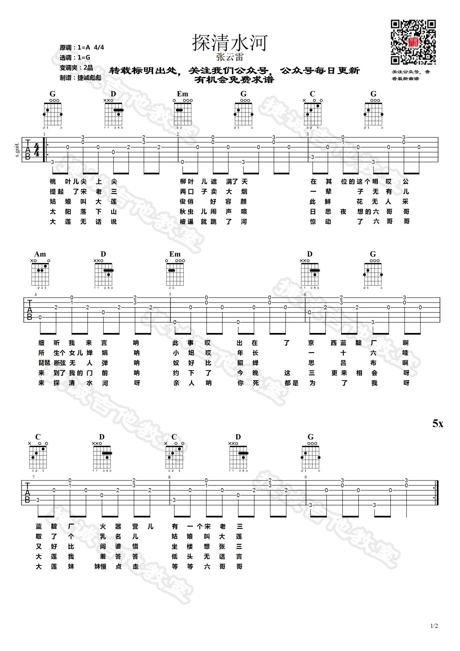 张云雷《探清水河》吉他谱捷诚吉他教室编配G调...