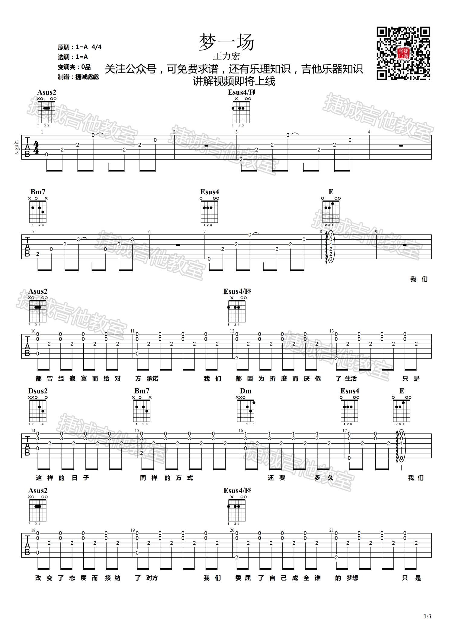 梦一场吉他谱王力宏原调A变调夹0品...