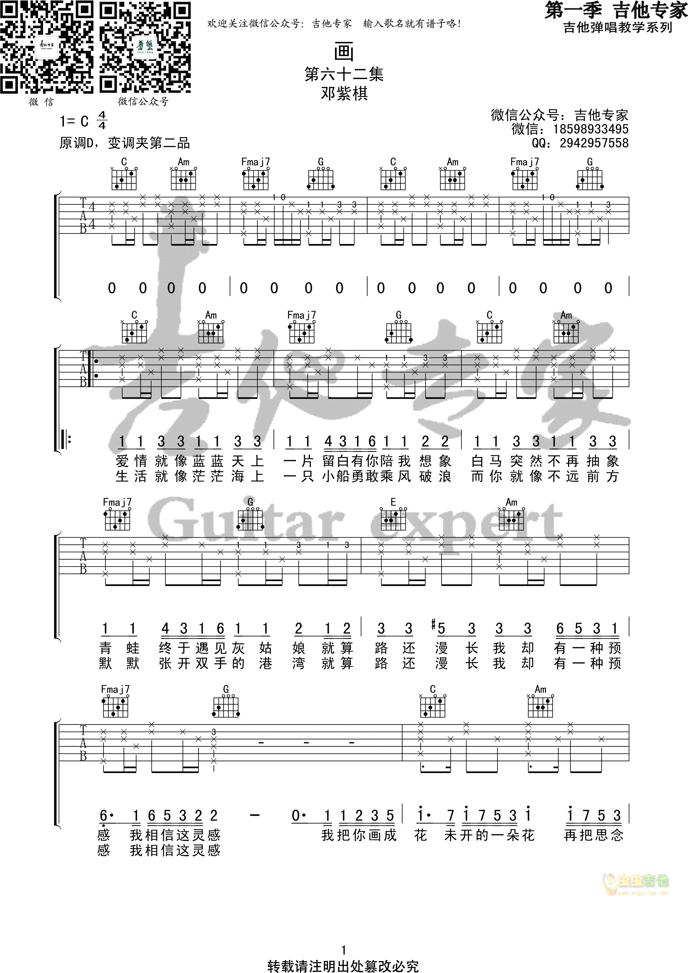 画邓紫棋吉他谱原调D变调夹2品...
