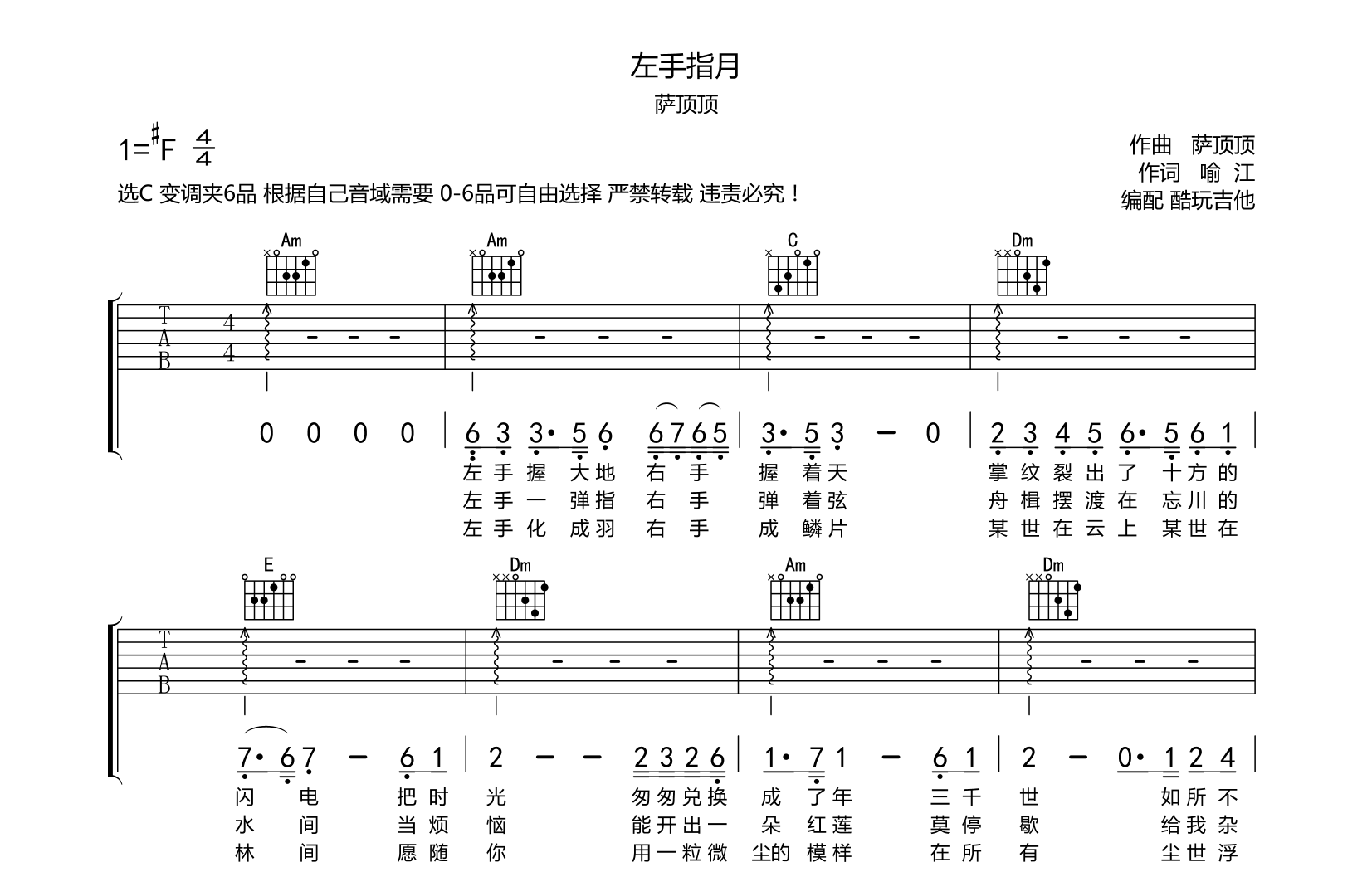 左手指月(初级版)吉他谱萨顶顶选C变调夹6品原曲音域太高可根据自己需求变调夹在0-6品自由选择...
