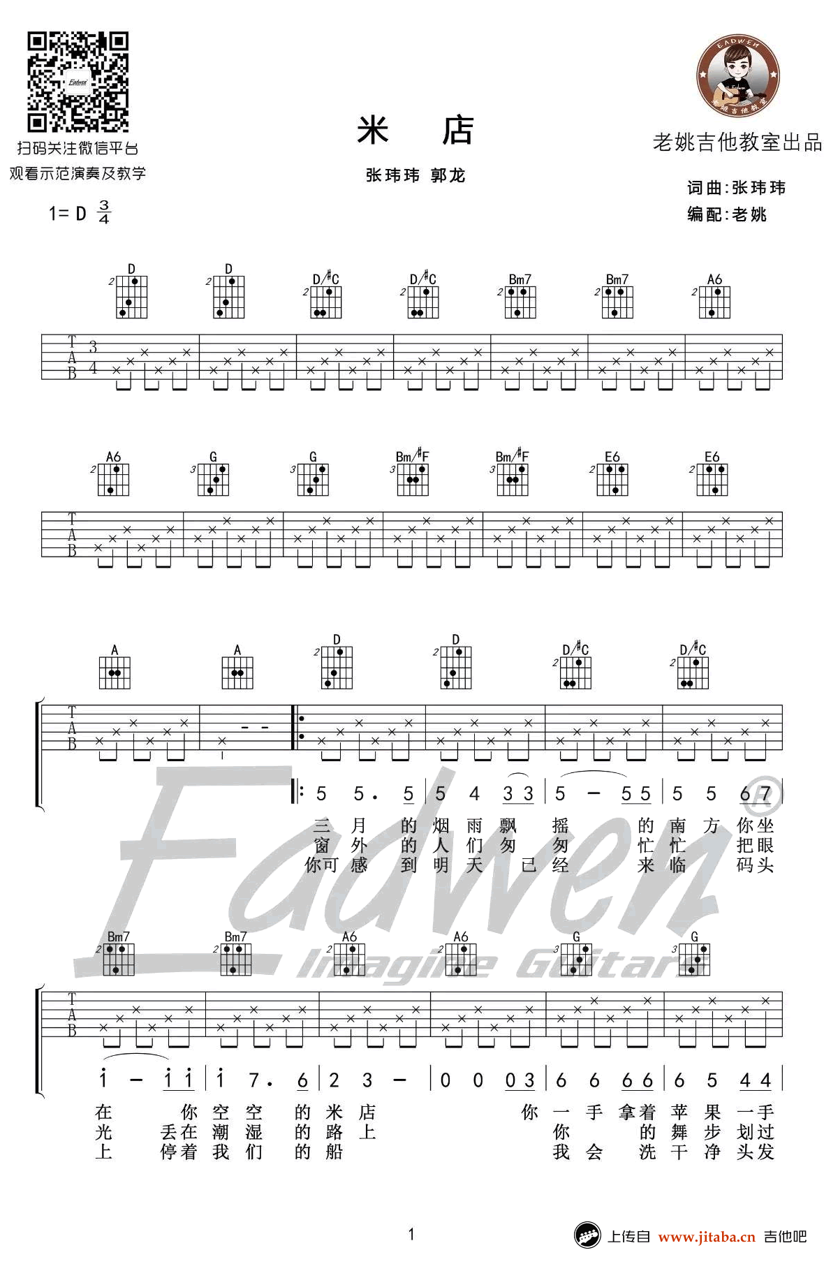 米店吉他谱原版简化版两个版本张玮玮曲谱分D调原版和C调简化版...