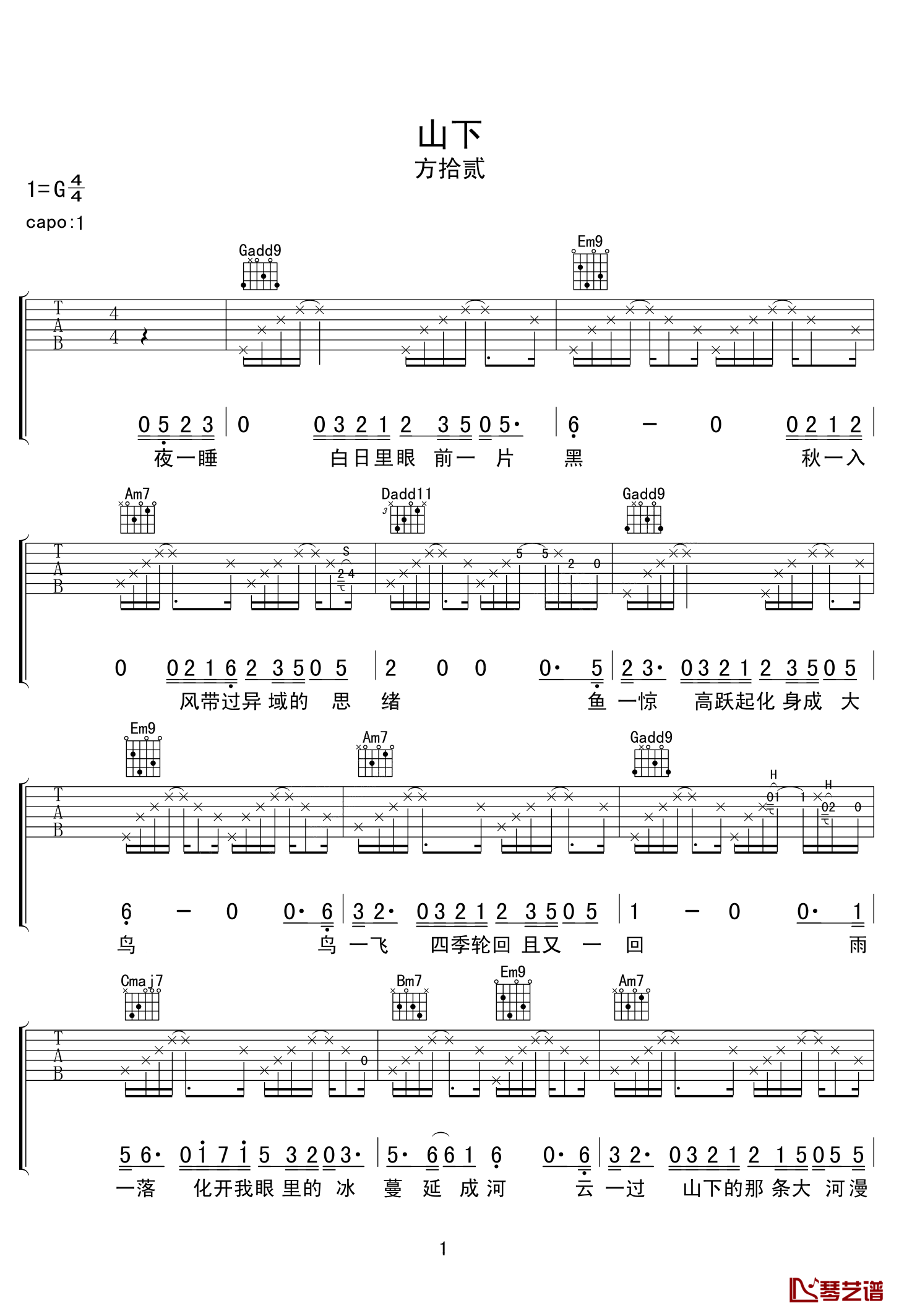 山下吉他谱方拾贰选用G调指法根据原版进行编配,夹变调夹1品...
