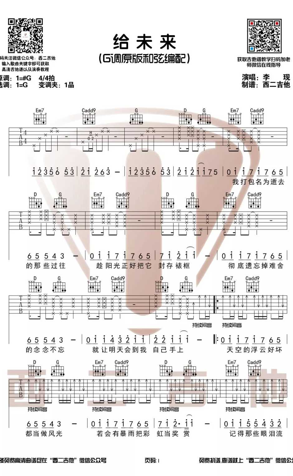 给未来吉他谱李现原调G调4/4拍,选用G调原版和弦编配,变调夹夹1品...