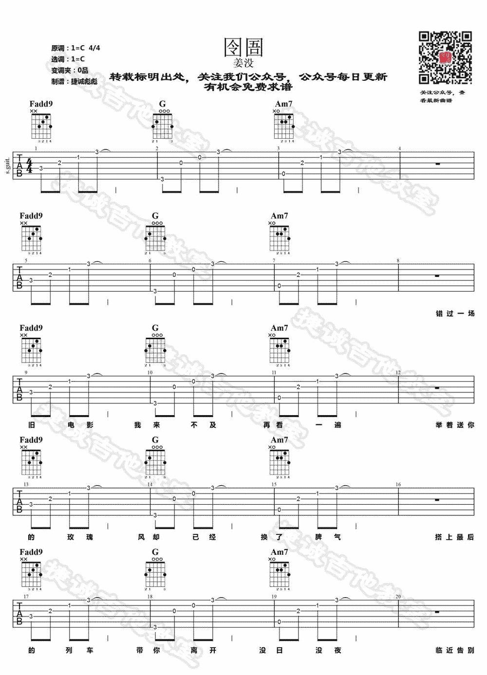 囹圄吉他谱-姜没曲谱选调C。《囹圄》吉他弹唱谱,捷诚吉他教室制谱。...