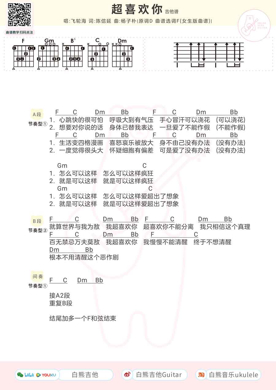 超喜欢你吉他谱飞轮海/沈以诚和弦谱曲谱两个版本,原调F,女生版本选调F,男生版本选调C。白熊音乐制谱...