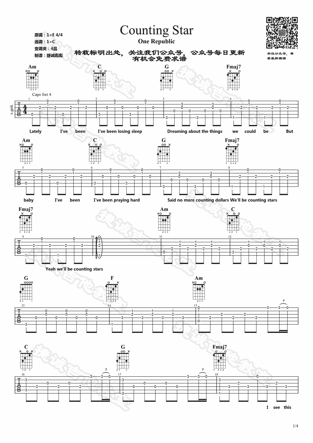 CountingStars吉他谱-OneRepublic原调E,本曲谱选C调和弦编配,CAPO=4品。...