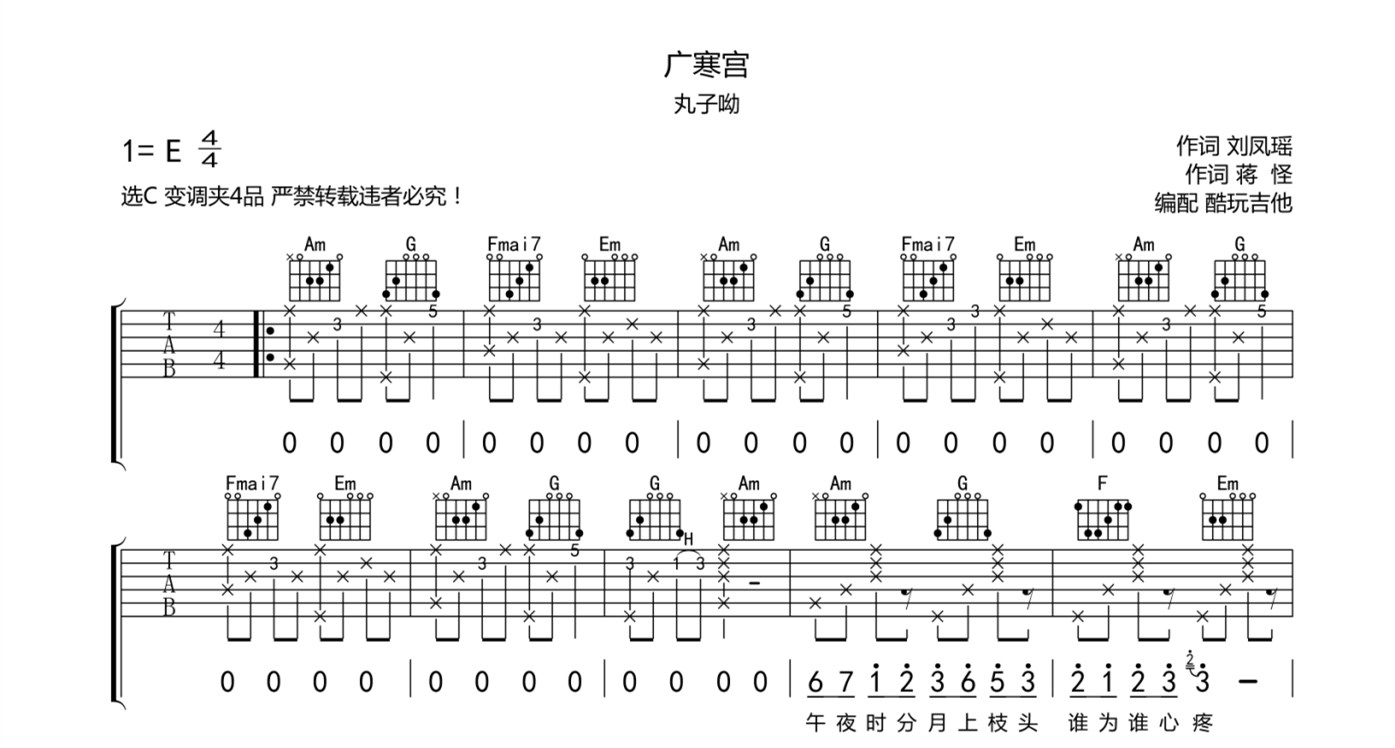 广寒宫吉他谱丸子呦古风选C变调夹4品注:休止符演奏方法,右手123弦弹奏完以后三个手指迅速放到相应的弦上,用作断音。...