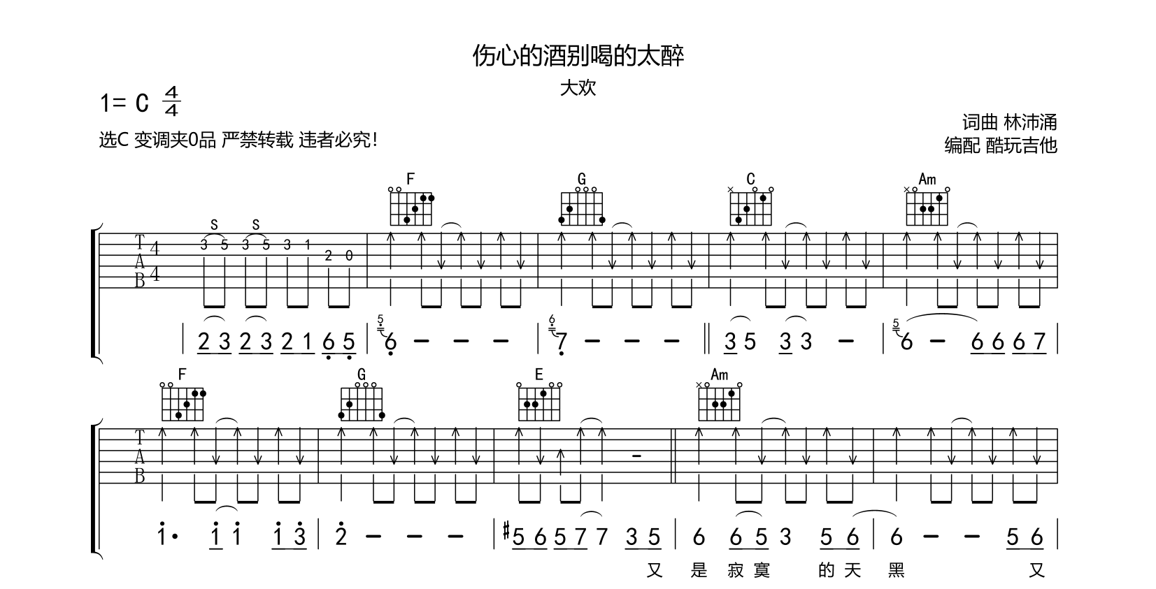 伤心的酒别喝的太醉吉他谱大欢选C变调夹0品编配简单适合初学者...