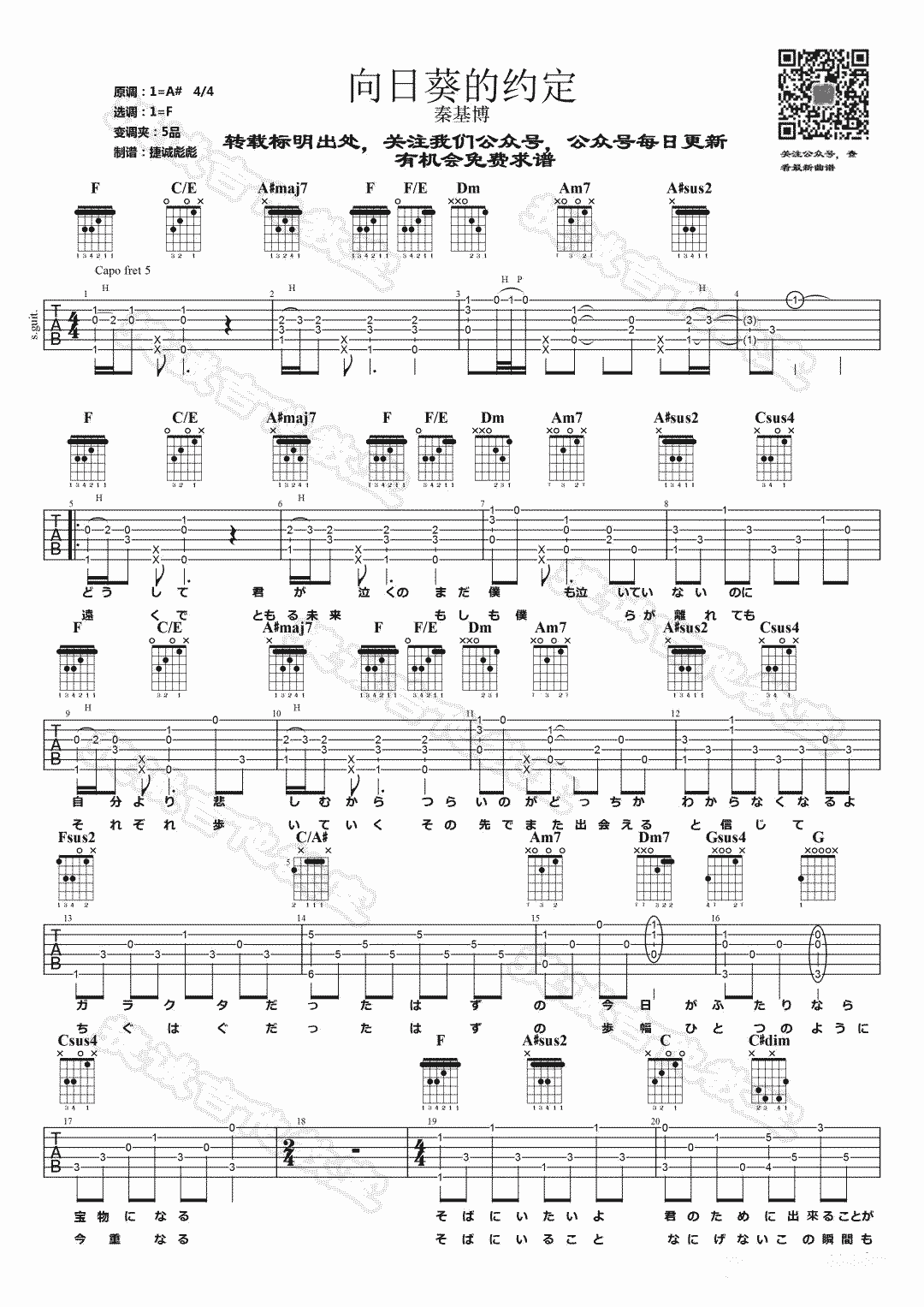 向日葵的约定吉他谱秦基博原调#A,选G和弦编配,CAPO=5品。日文歌曲...