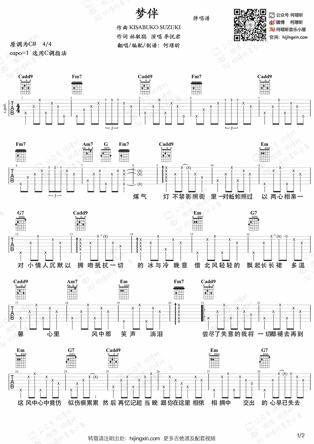 梦伴吉他谱-李悦君原调#C,选C调和弦指法编配,CAPO=1品...