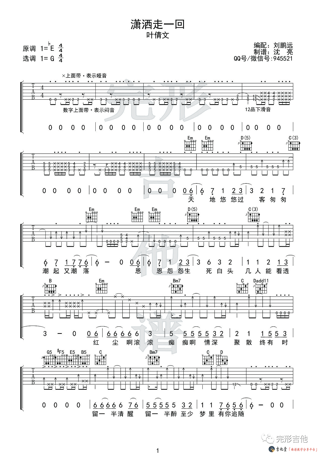 吉他《潇洒走一回》吉他谱 刘鹏远改编扫弦版