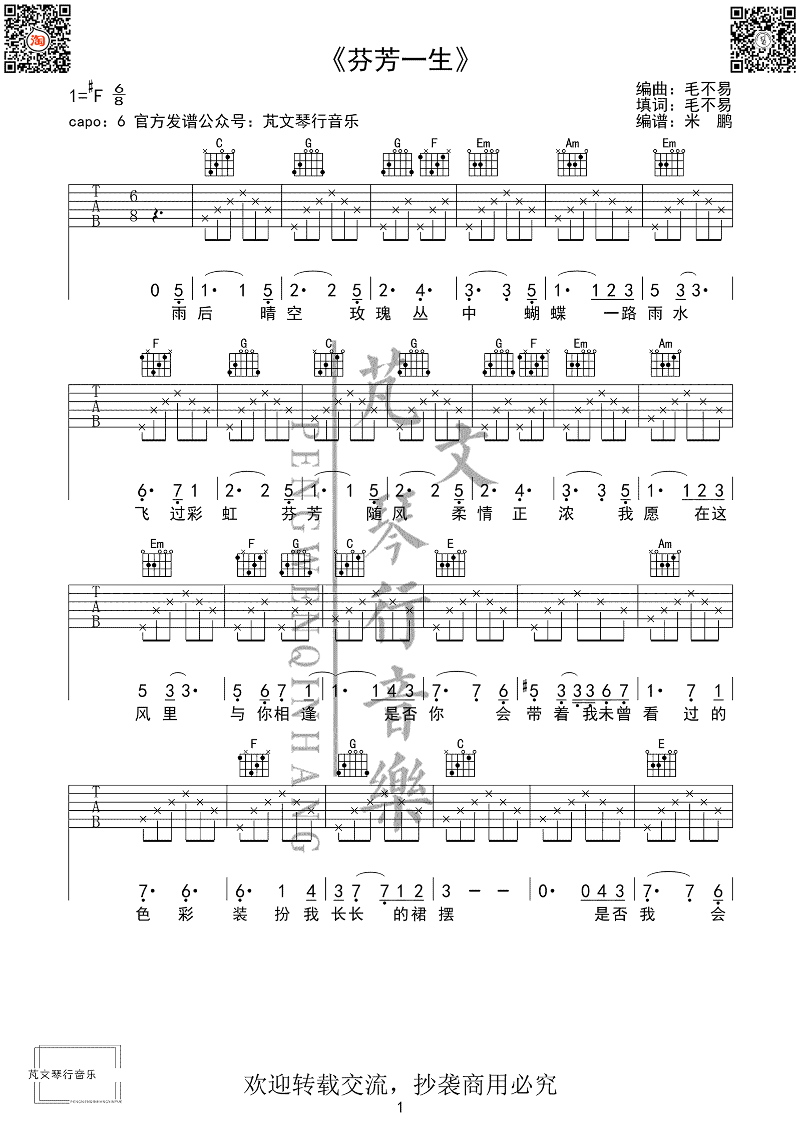 芬芳一生吉他谱毛不易/刘惜君原调#F,CAPO夹一品。...
